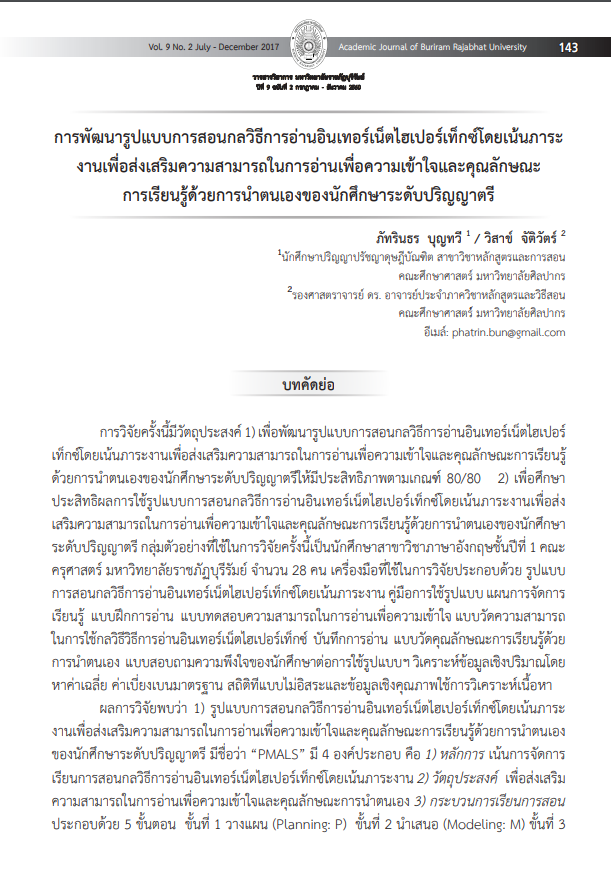การพัฒนารูปแบบการสอนกลวิธีการอ่านอินเทอร์เน็ตไฮเปอร์เท็กซ์โดยเน้นภาระ งานเพื่อส่งเสริมความสามารถในการอ่านเพื่อความเข้าใจและคุณลักษณะ การเรียนรู้ด้วยการนำ ตนเองของนักศึกษาระดับปริญญาตร