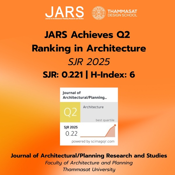 The Faculty of Architecture and Planning, Thammasat University, is pleased to announce that the Journal of Architectural/Planning Research and Studies (JARS) has been ranked Quartile 2 (Q2) in the field of Architecture in the SCImago Journal Rank (SJR) 2025 rankings.