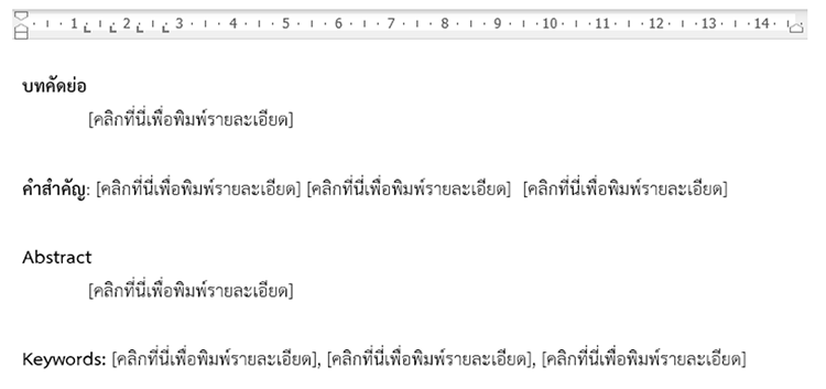 2.5.6 บทคัดย่อ (abstract) กำหนดให้มี 1 หรือ 2 ย่อหน้าเท่านั้น ให้พิมพ์บทคัดย่อทั้งภาษาไทยและภาษาอังกฤษ โดยเนื้อหาทั้งสองภาษาจะต้องสอดคล้องกัน และถูกต้องตามหลักไวยกรณ์ จำนวนคำที่ปรากฎจะต้องไม่เกิน 300-350 คำ ให้กำหนดคำสำคัญ (keywords) จำนวน 3 – 5 คำ เพื่อให้ในการสืบค้นบทความ